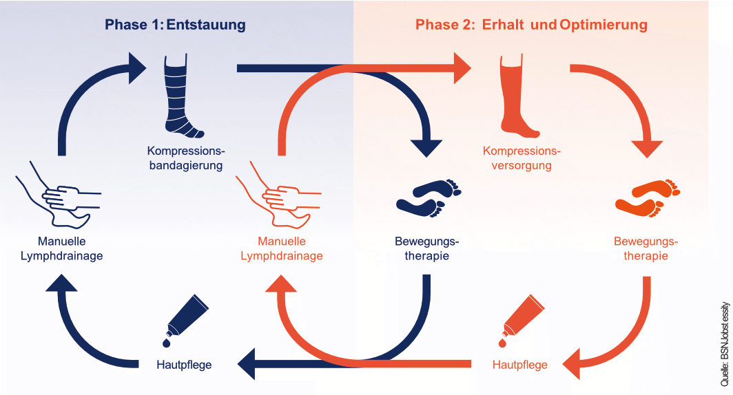 Es ist erforderlich, dass der Patient eine regelmäßige, komplexe physikalische Entstauungstherapie (KPE) kombiniert mit manueller Lymphdrainage (MLD) und Kompressions-bekleidung nach Maß bekommt.